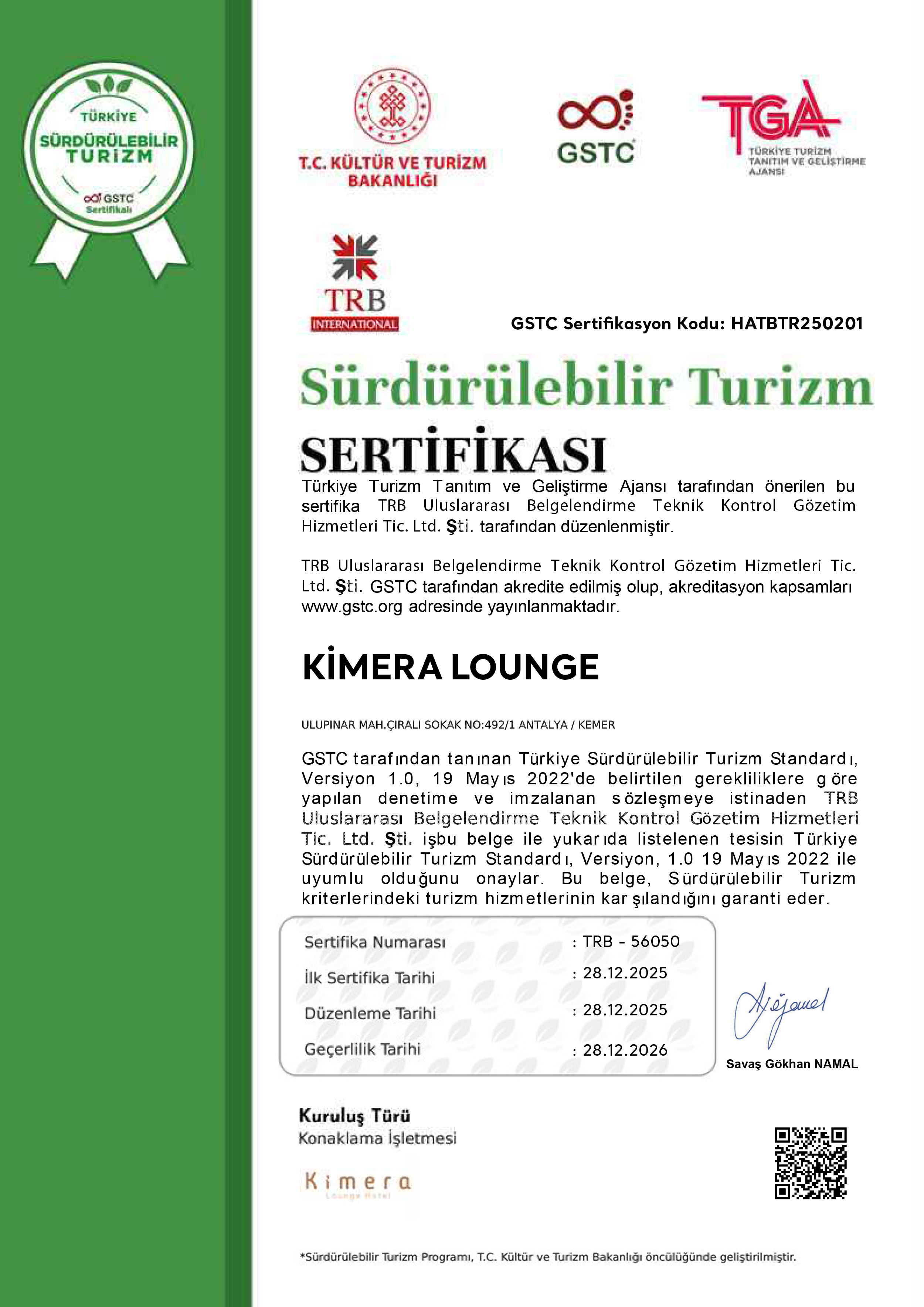 Bugün Kimera, T.C. Kültür ve Turizm Bakanlığı tarafından verilen “Sıfır Atık Belgesi” ve 3. Aşama Sürdürülebilir Turizm Belgesi ile bu kararlılığını resmileştirmiş durumda.