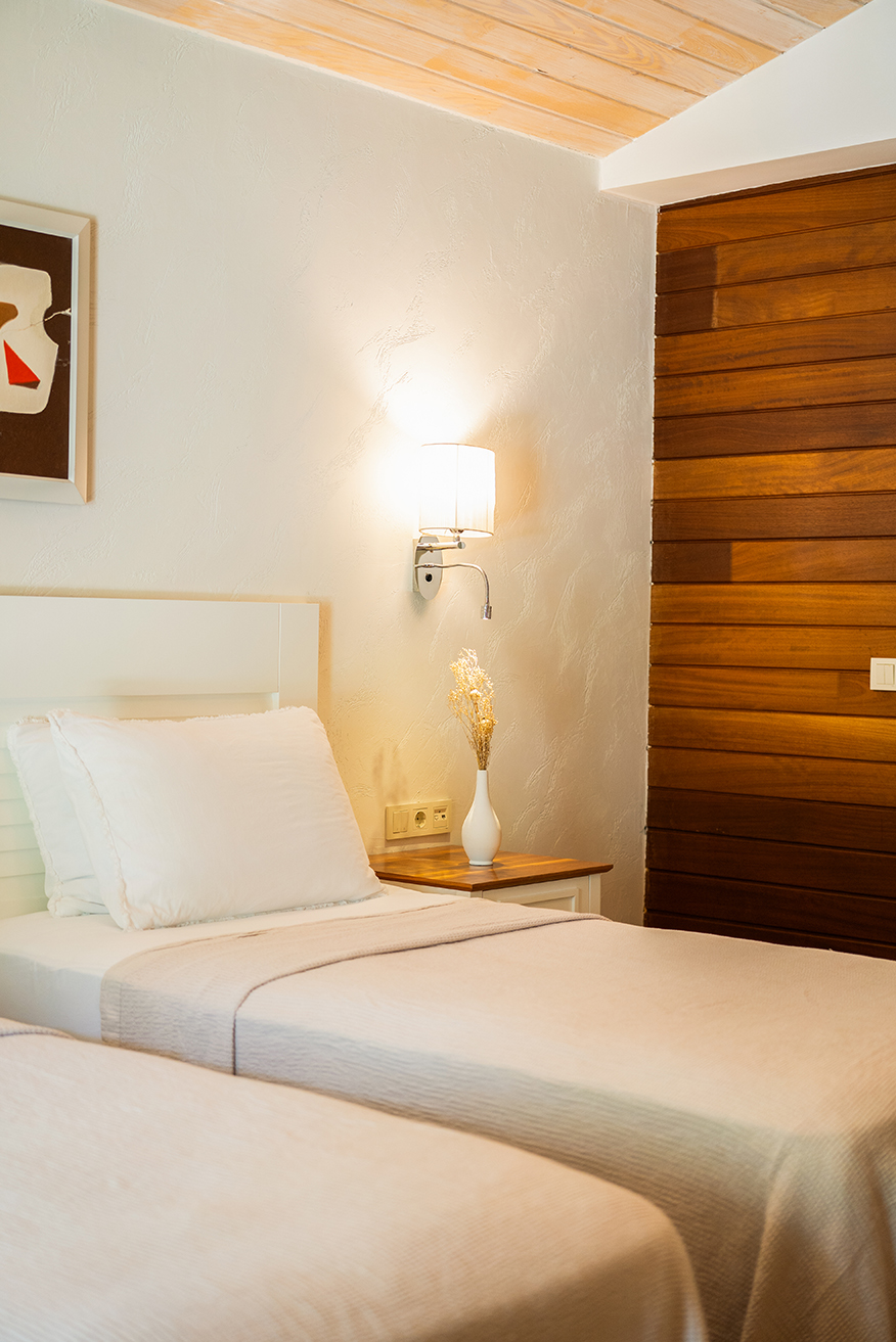 Бунгало-близнецы, уютно расположившееся в саду, — это тихое место, где ощущается единение с природой. Когда солнце пробивается сквозь листву, время словно замедляется и вам остаётся только наслаждаться моментом.
