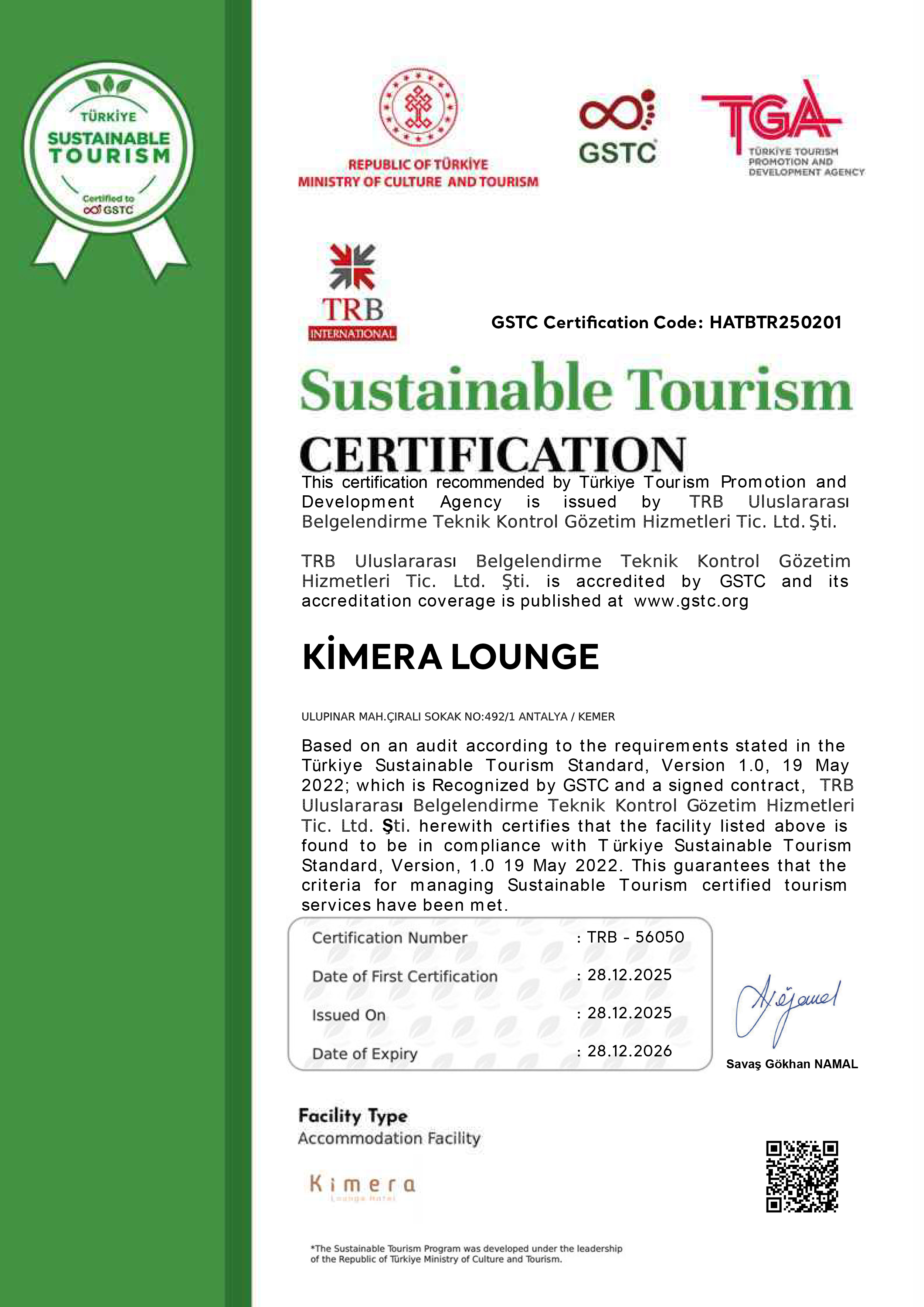 Сегодня Отель Кимера официально подтверждает свою приверженность этому пути, имея Сертификат «Нулевые отходы» и 3-й уровень Сертификата «Развитие Туризма» , выданные Министерством Культуры и Туризма Турции. Для нас главное — это идея, лежащая в основе этих сертификатов: «Жить просто, в гармонии с природой, и оставить будущим поколениям лучший мир , чистую землю и прекрасную природу» и конечно же наши старания .